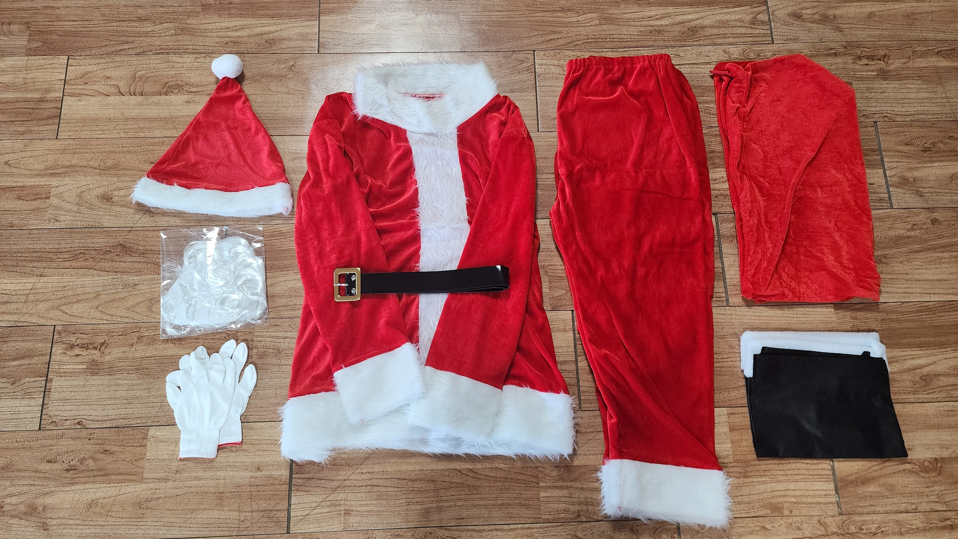 Christmas Santa Claus costume set of 8: top+pants+hat+beard+gloves+belt+boots+gift bag