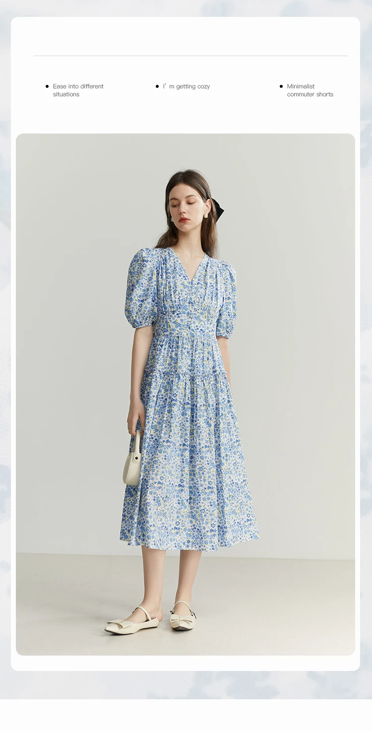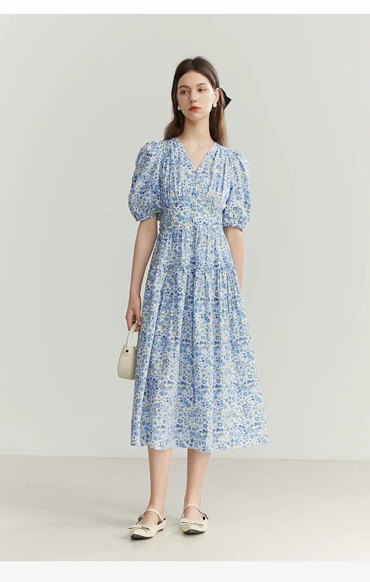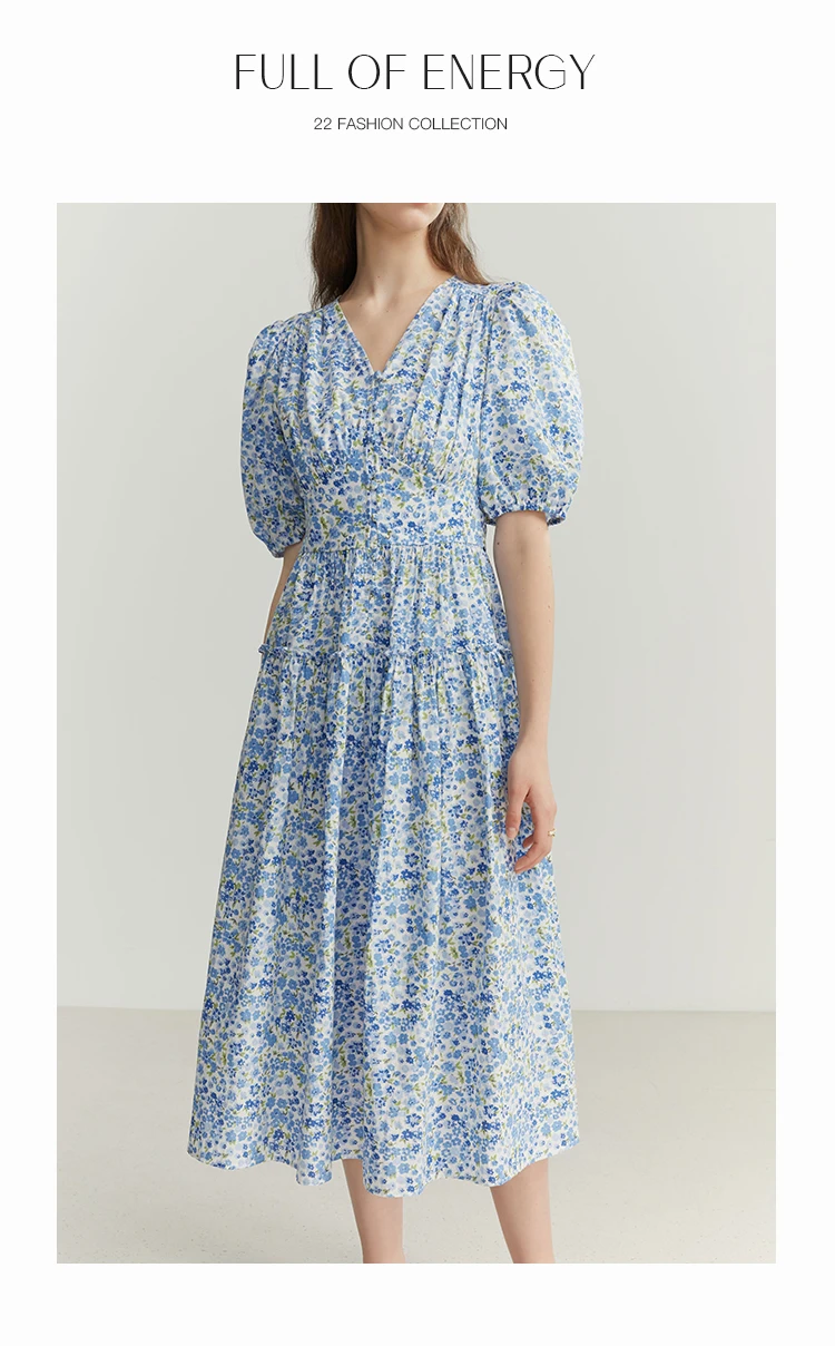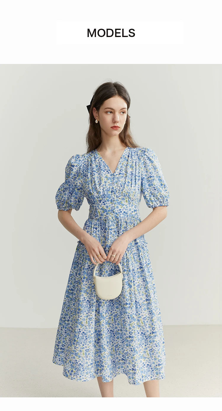 FSLE Blue Romantic Floral Dress Women Elegant Vintage High Waist V-neck Puff Sleeve Summer Printing Female Cotton Long Skirts