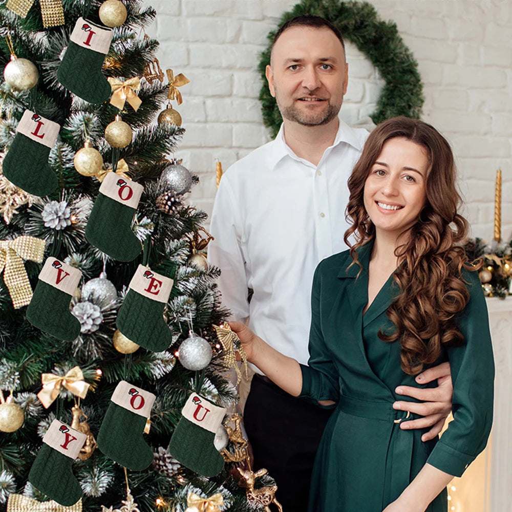 Green A-Z Letter Hanging Christmas Stockings Monogram Knitted Socks Fireplace Christmas Tree Hanging Party Decoration
