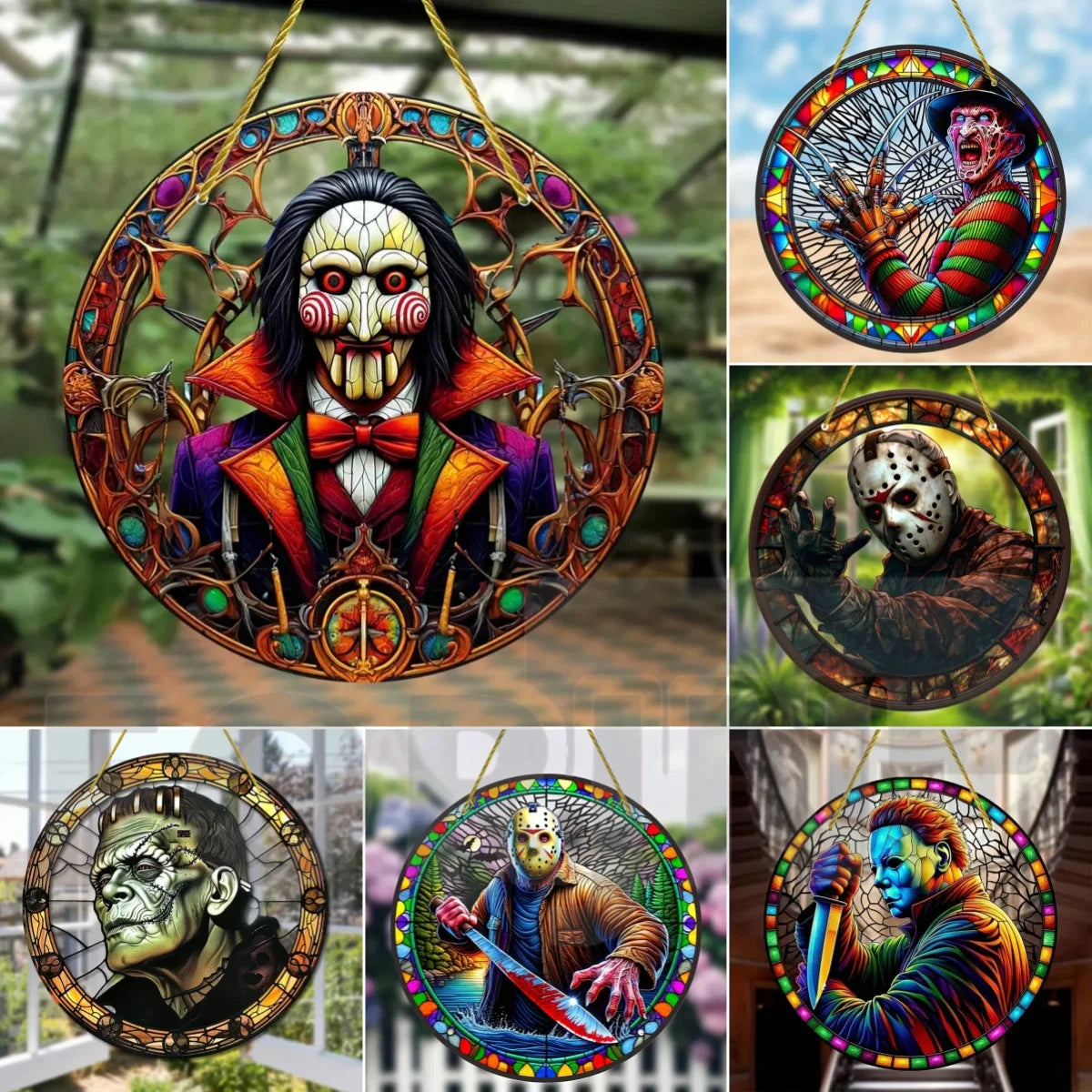 Horror Theme Stained Window Hanging Sun Catcher,Round Acrylic Translucent Sign,Halloween Decor for House,bar,Porch,Patio Garden