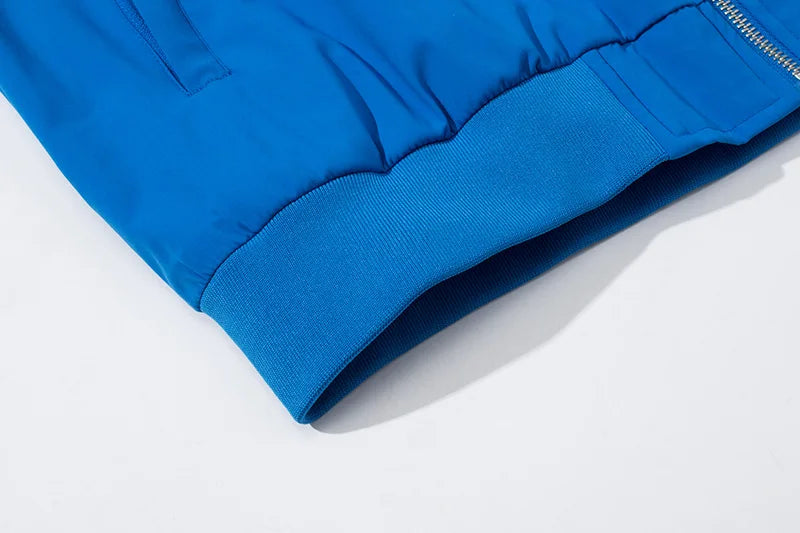 ● Full zip up closure, stand collar, ribbed knit cuffs and hem.