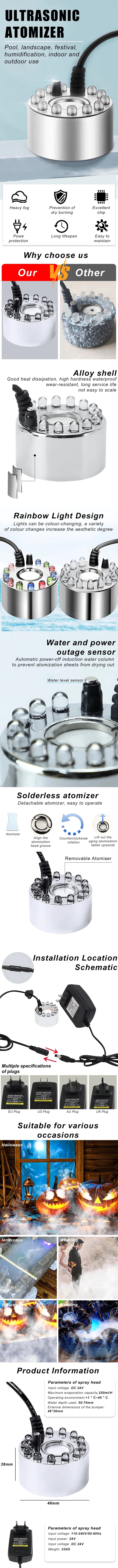 Waterproof Ultrasonic Mister Fogger, no heat or chemicals used, can produce enough fog. Aerosolized amount ≥ 350ml/H. Fogger with Removable Splash Guard and non-toxic ABS Plastic Bucket, sturdy and durable. Holiday Atmosphere maker, best gift for kids or friends. (Tips: Please don't add to hot water)