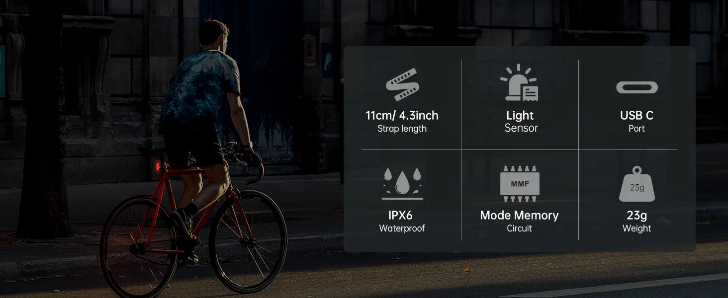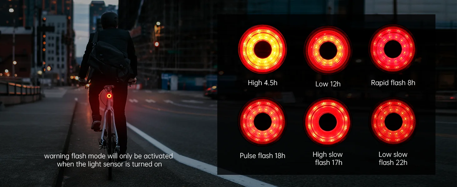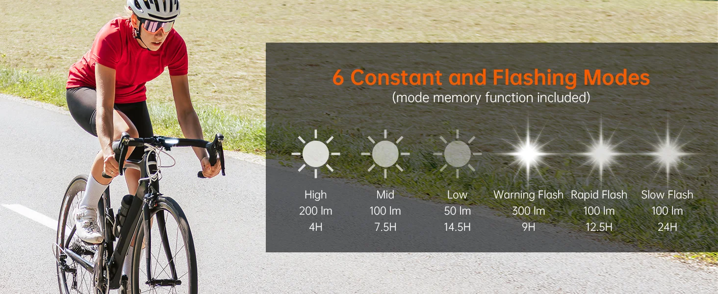 【6 Modes& Side Visibility】3 constant modes and 3 flashing modes. It gives out 300 lumens in the warning flash mode.Mode memory function to remember the last used mode. The wide-angle lens, increase your side visibility when riding through the crossroad.