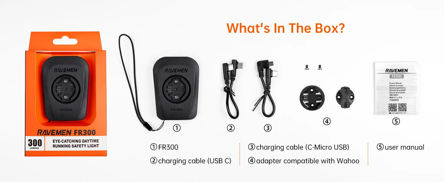 【Tether & 2 charging cables included】Use the tether(already installed)to secure the light or computer for gravel or unpaved road riding.It comes with USB-C cable and USB-C to micro USB cable included.FR300 has a 2 year warranty, if you have any questions during use, please feel free to consult.
