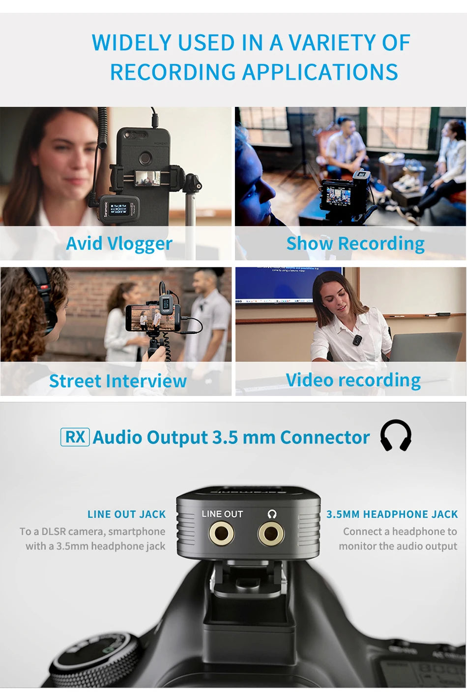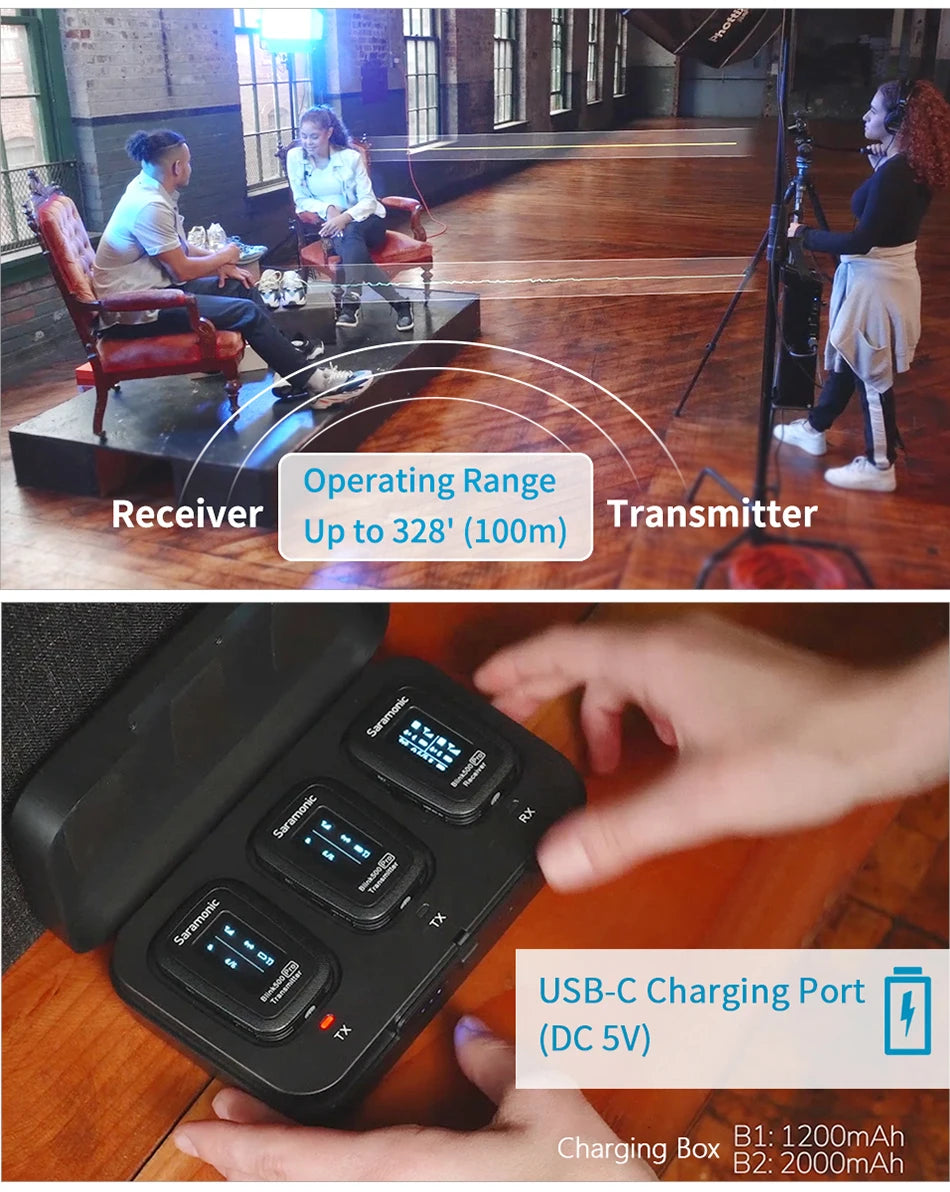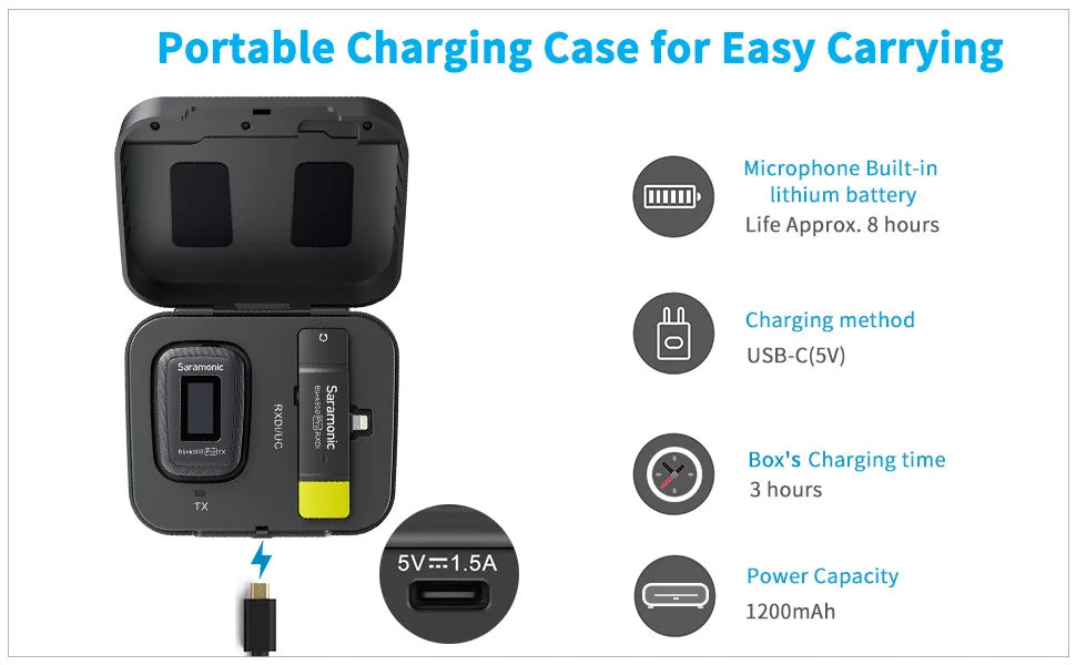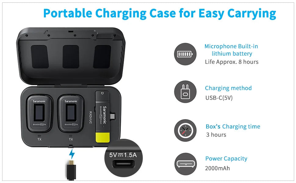 The transmitters and receivers deliver a remarkable 8-hours of run time on a single charge and featurequick charging. The supplied charging case allows you to charge the transmitters and receivers anywhere and can be recharged or powered via the USB-C DC 5v port using USB-A chargers and battery packs.