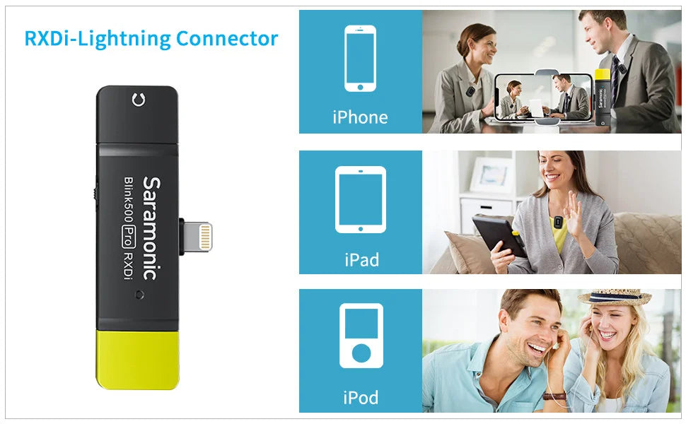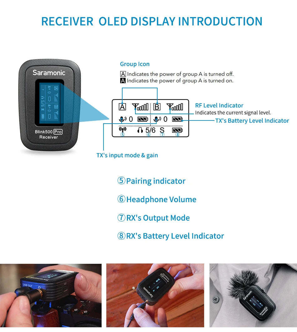 The system series is comprised of three different receivers. The Blink500 Pro RX receiver has a vivid OLED display and a 3.5mm output. It also includes both TRS and TRRS output cables, allowing it to work with cameras, mobile devices, computers and any device with a 3.5mm audio input. The Blink500 Pro RXDI receiver has a MFi Certified Lightning output and is designed for Apple iOS devices.