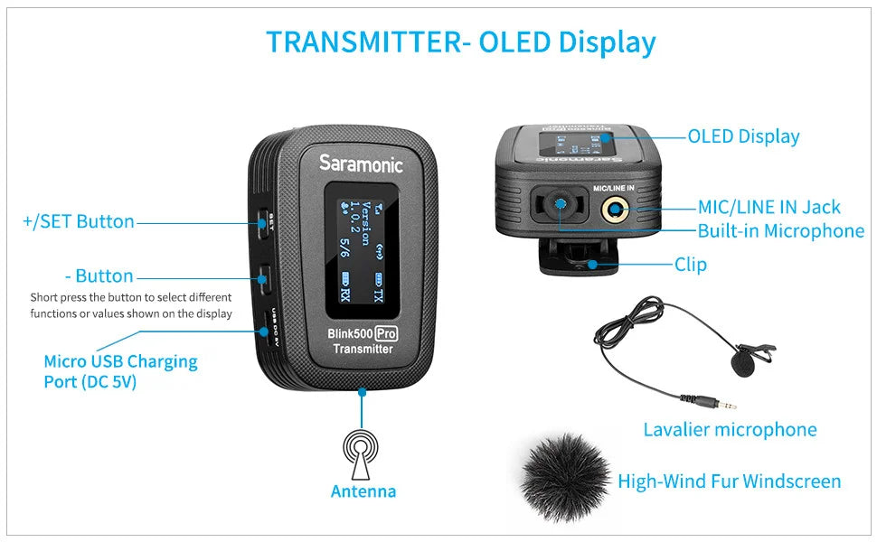 The Blink 500pro TX clip-on transmitter has a great sounding built-in omnidirectional microphone and it is small and light enough to clip to shirts and clothing, or you can use it as a traditional belt pack transmitter with the included SR-M1 professional lavalier microphone. It features a vivid OLED display and has 3.5mm input for microphones and line-level inputs.