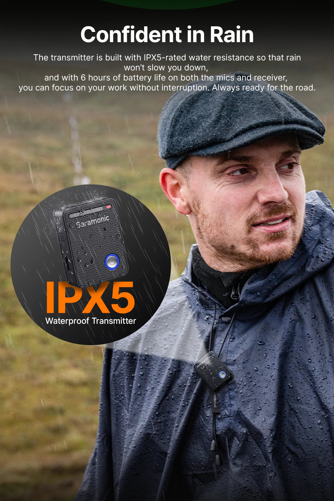 The transmitter of this system is IPX5-rated for water resistance, performing well in harsh environments.