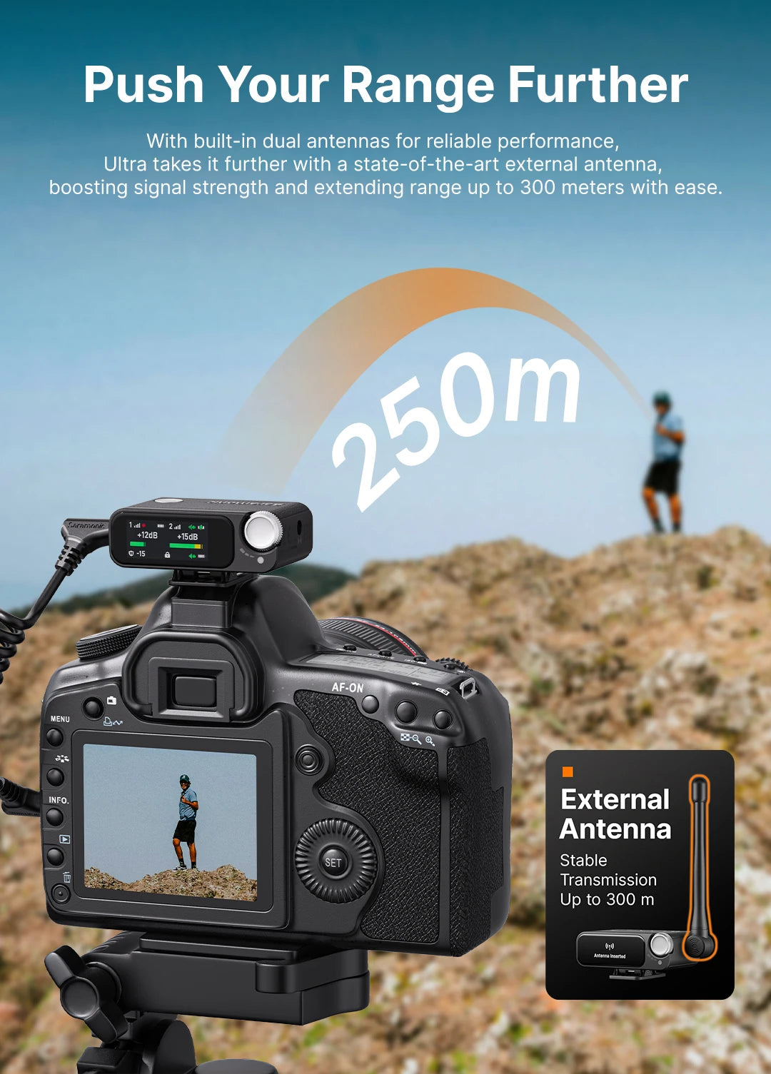 Saramonic Ultra, a portable ultimate 2-channel wireless microphone system, provides professional-quality sound within 300 meters* of transmission range. It is ideal for broadcasting, presentations, mobile journalism and more.