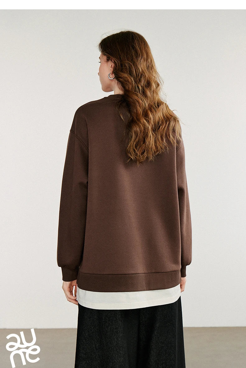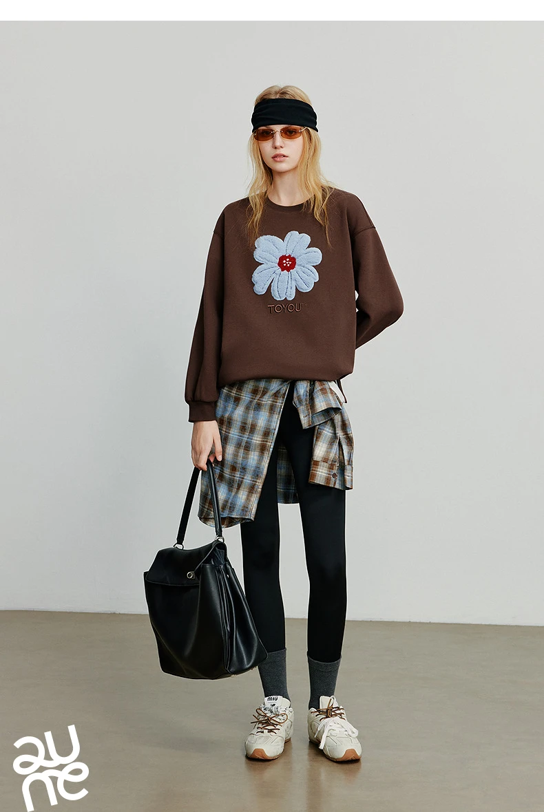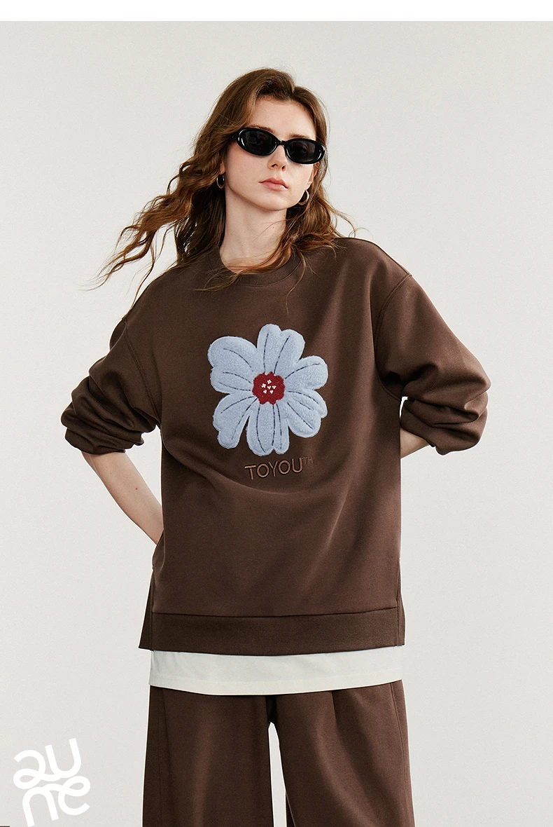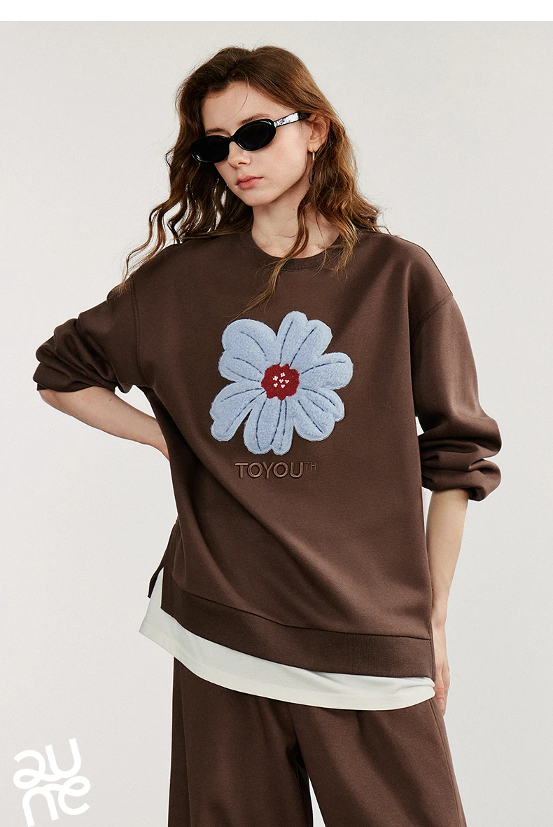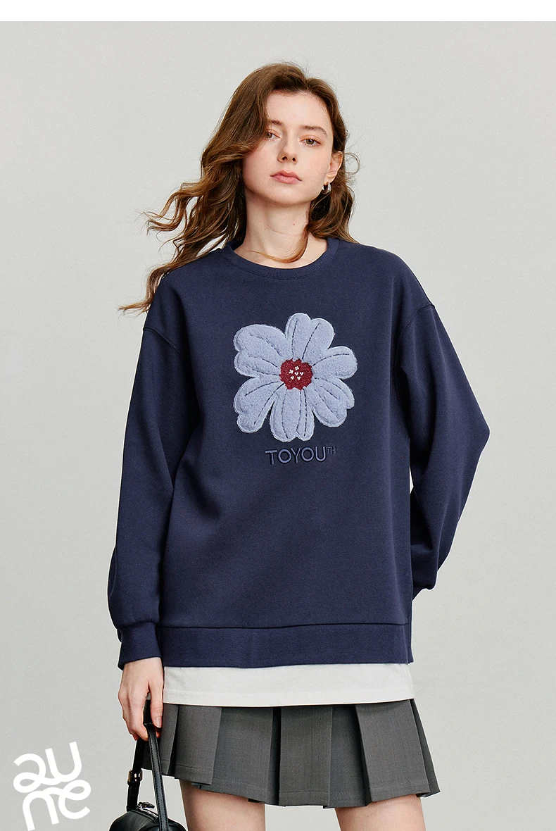 TOYOUTH Women Hoodies Sweatshirt 2025 Autumn New Plush Flower Printed Contrasting Color Splicing Fake Two Piece Cotton Pullover